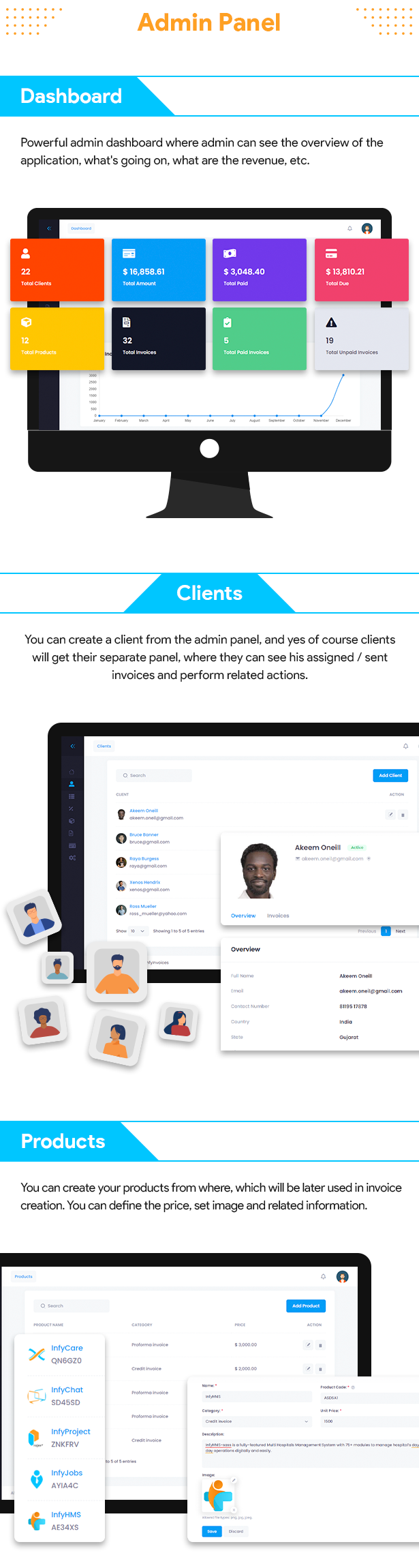 Ini adalah Sistem Manajemen Faktur tempat pengguna dapat mengelola semua faktur di satu tempat dan secara digital. Klien akan mendapatkan panel login terpisah tempat ia dapat melihat daftar faktur dan melakukan pembayaran.